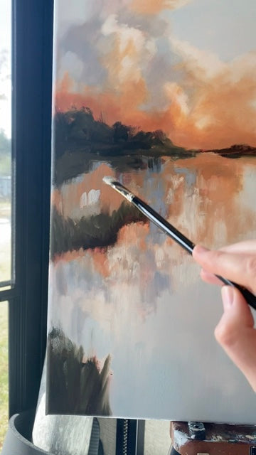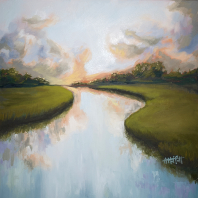 A peaceful tidal creek winds through sunlit marsh grasses in this serene Lowcountry landscape. Soft reflections drift across the water as hints of coastal breezes animate the golden reeds. Painted with expressive brushwork and layered texture, this scene captures the quiet rhythm of the South Carolina coast.