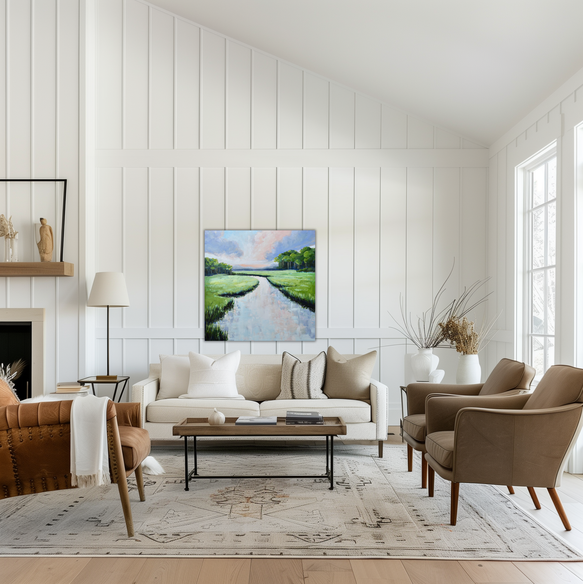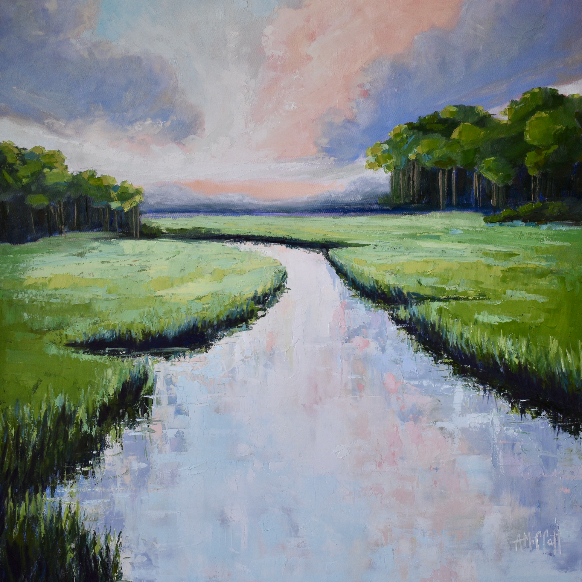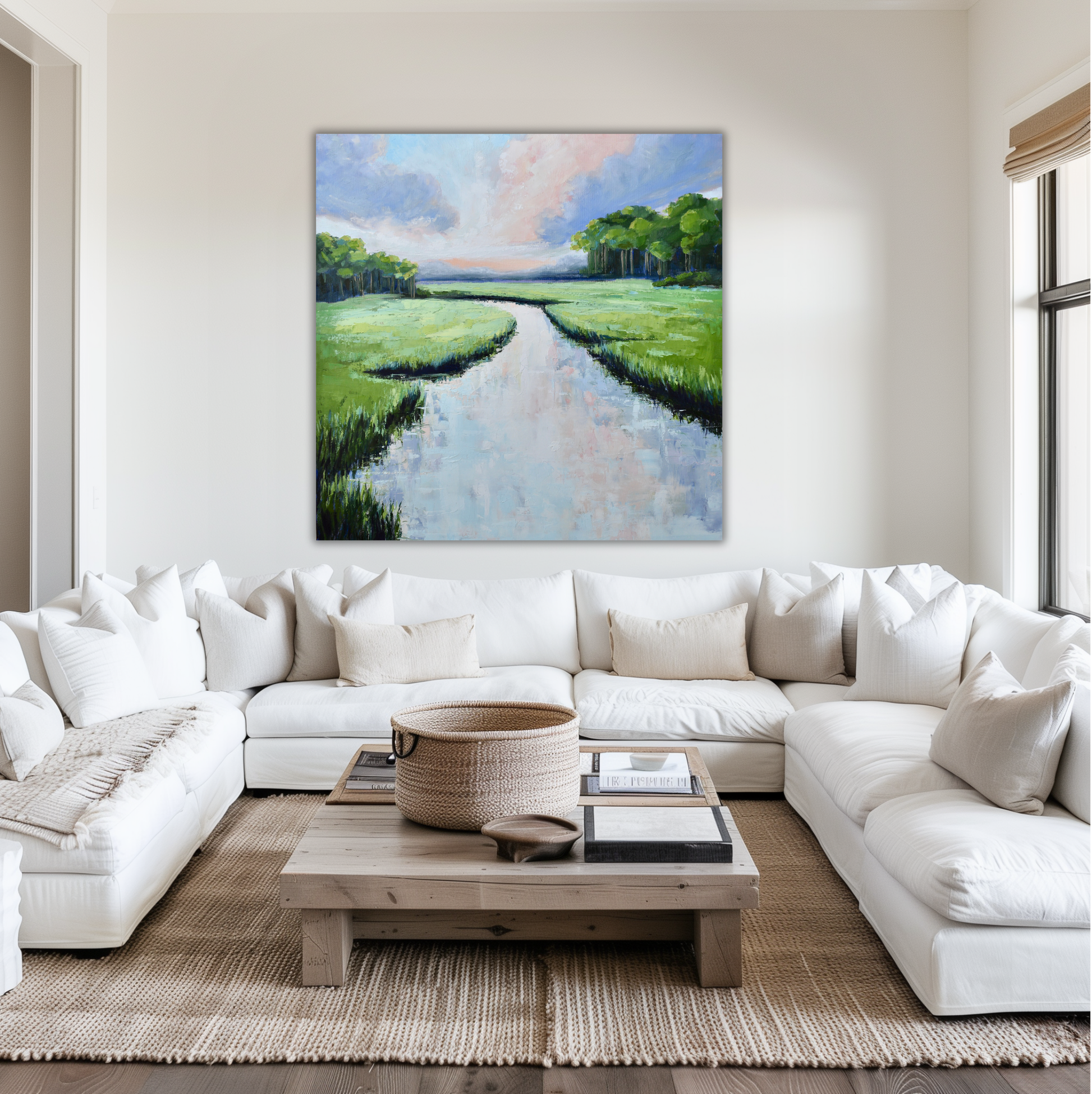 Painted in my signature impasto style, it captures the way light dances on the calm waters of a tidal creek near Bowen Island a Folly Beach, SC. This is one of my favorite paddle board spots. I took a first pictures of the marsh and came home to paint. I distinctly loved the periwinkle clouds rising above the waters as the sun set.